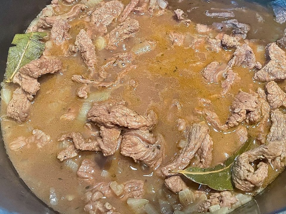 2. Season with salt, pepper, and paprika, and pour in the broth. Let it simmer until the meat is tender, about 40 minutes. Stir the pot and taste test along the way.