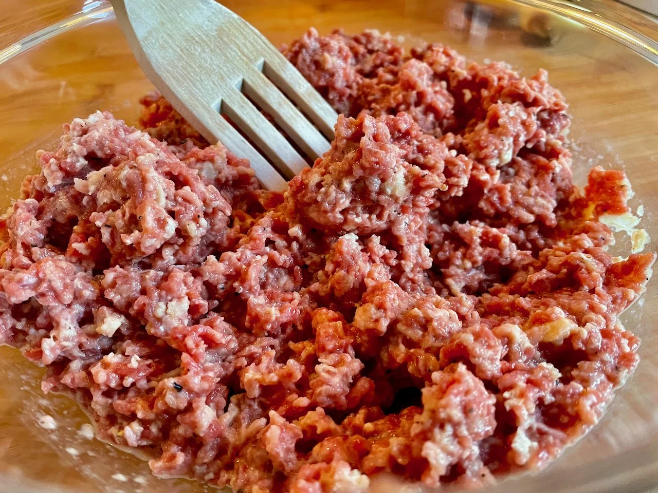Be cautious not to overmix the ingredients, as this could result in tough meatballs. If you prefer to use a mixer, add all the ingredients at once and let the machine work for 15-30 seconds, just enough to evenly combine them.
