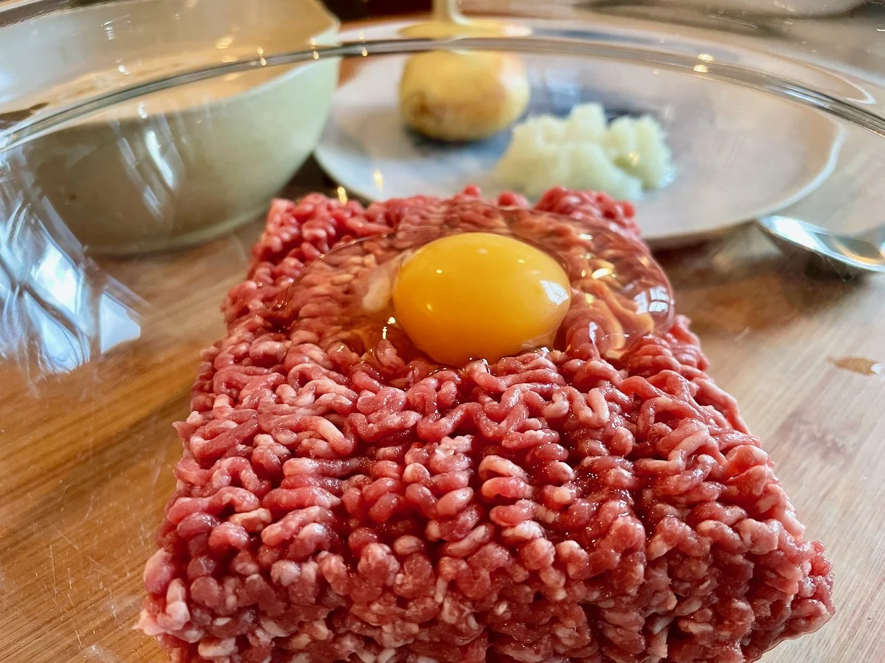 In a mixing bowl, combine the ground beef and salt. Add the pepper, whisked egg, and the milk-soaked bread mixture.