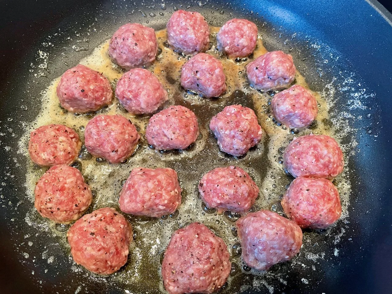 Heat a pan with butter over medium heat. Fry a smaller batch of meatballs at a time, gently shaking the pan to ensure they maintain their round shape.