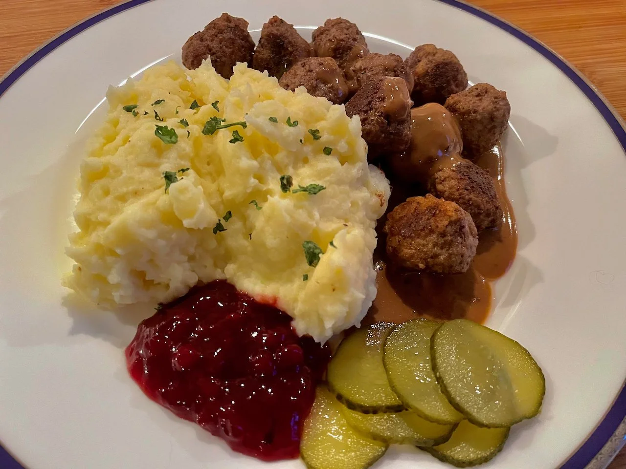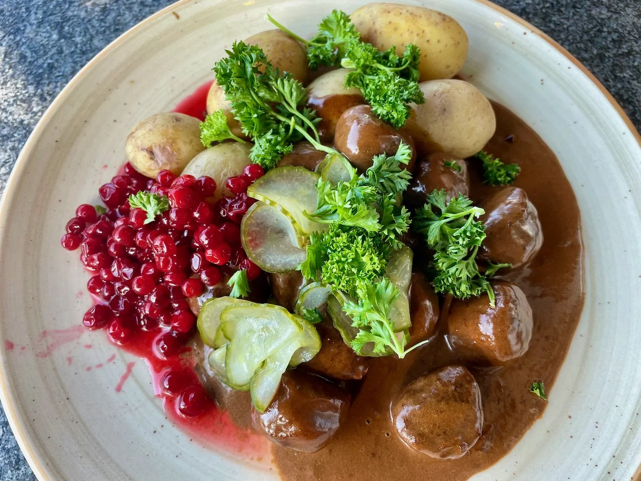 Serve the meatballs with your choice of potatoes, creamy pepper sauce, and lingonberry jam.
