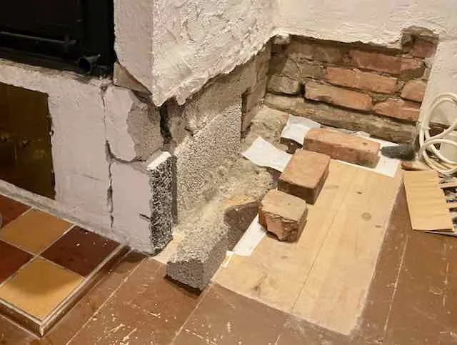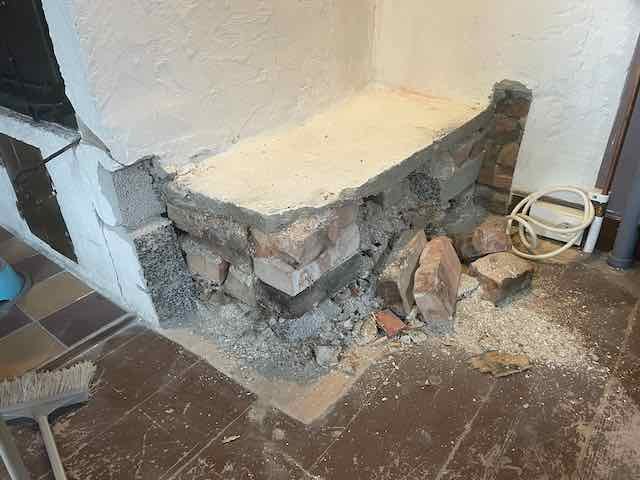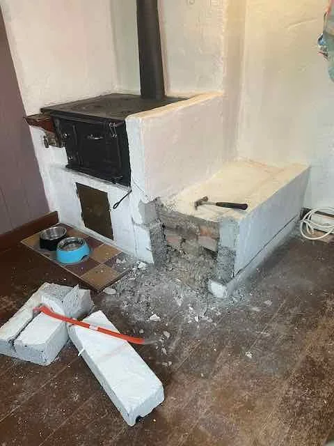 While removing part of the old wood-burning oven base, sections of the surrounding structure were damaged. These areas were repaired and rebuilt, filled with cement, and finished with a fast-drying white compound (Husfix). All exposed parts were then covered with non-flammable materials, and protective metal mesh was installed to prevent rodents from accessing the space beneath the new installation and to eliminate drafts from under the house.